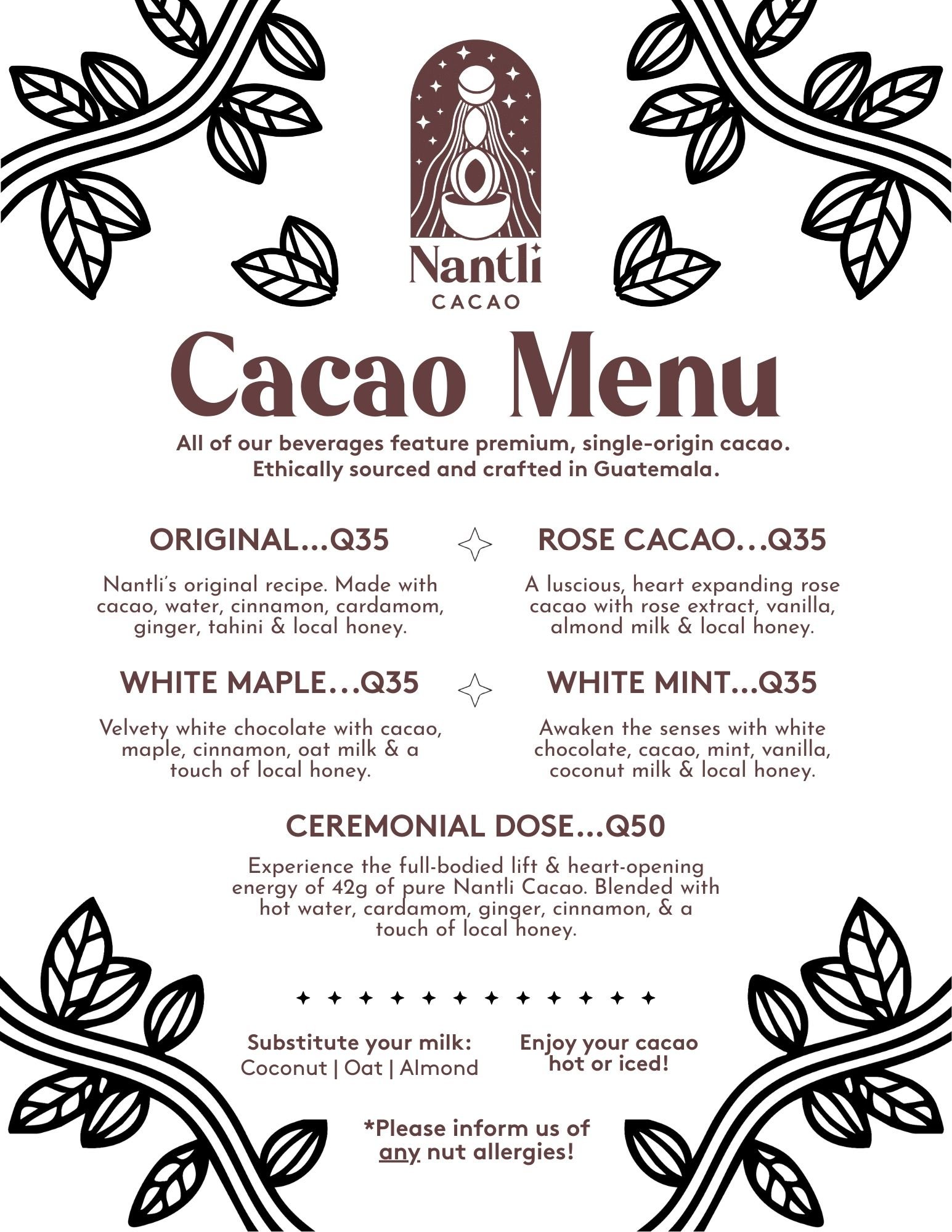 Our thoughtfully crafted menu will leave you wanting more. Featuring unique recipes that will impress your taste-buds and inspired to make more crafty cacao drinks at home